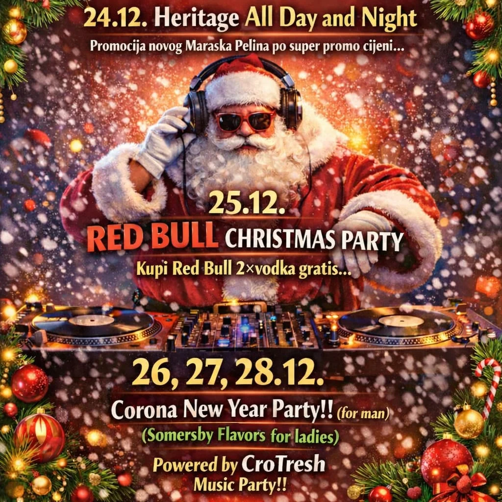 Vrhunac blagdanskog programa stiže 25. prosinca, kada je na rasporedu Red Bull Christmas Party. Očekuje vas večer puna energije, dobre glazbe i posebne akcije – uz kupnju Red Bulla, 2× vodke gratis, što je savršen recept za nezaboravnu božićnu noć.