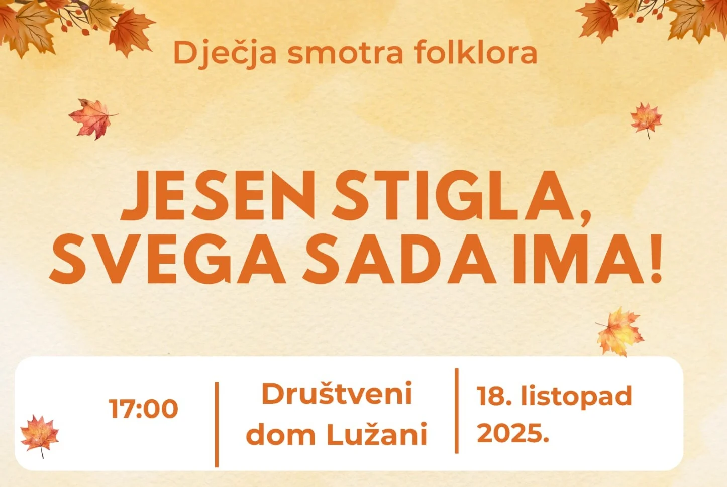 U subotu, 18. listopada 2025. godine, u Društvenom domu u Lužanima, održat će se vesela i razigrana Dječja smotra folklora pod nazivom „Jesen stigla, svega sada ima!“.