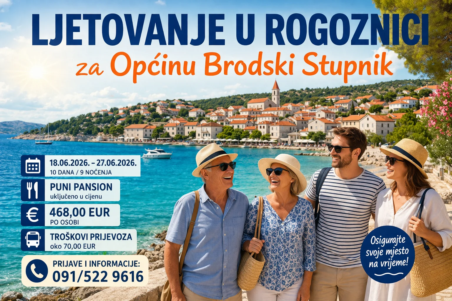 Ljetovanje će se održati u razdoblju od 18. do 27. lipnja 2026. godine, a cijena aranžmana iznosi 468 eura po osobi uz puni pansion. Dodatno se plaća prijevoz, čiji se trošak procjenjuje na oko 70 eura.