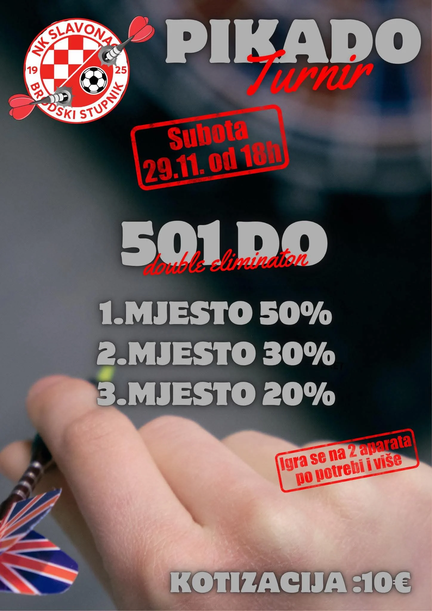 NK Slavonac Brodski Stupnik organizira uzbudljiv pikado turnir koji će se održati u subotu, 29. studenoga od 18:00 sati.