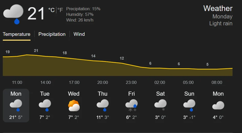 Najviše dnevne temperature kretat će se od 15 do 20 °C, no prema večeri slijedi postupan pad, osobito u unutrašnjosti. Tijekom noći, u višim goranskim predjelima padat će snijeg.