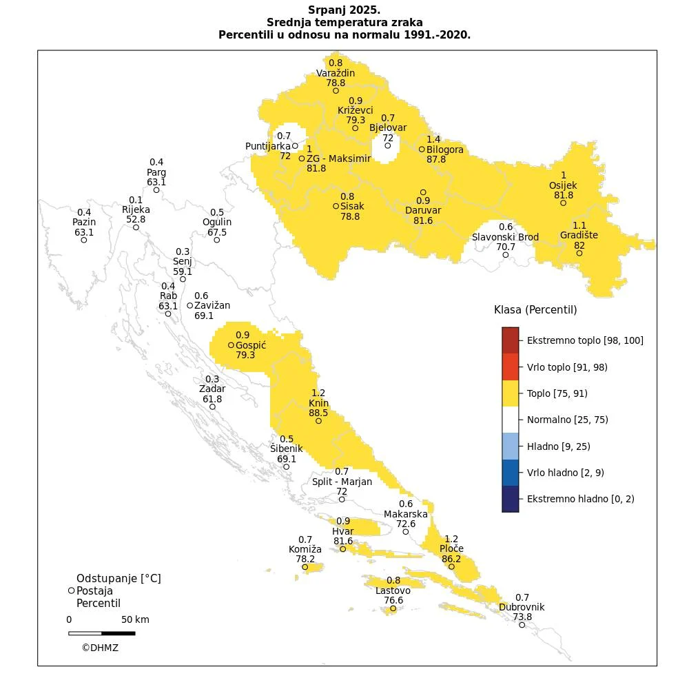 Dok se posljednjih tjedana uglavnom piše o velikim vrućinama, podaci Državnog hidrometeorološkog zavoda otkrivaju i jednu zanimljivu činjenicu – srpanj 2025. bio je topao u većem dijelu istočne i središnje unutrašnjosti, no okolica Slavonskog Broda svrstava se među rijetka područja gdje temperature nisu odstupale od prosjeka.