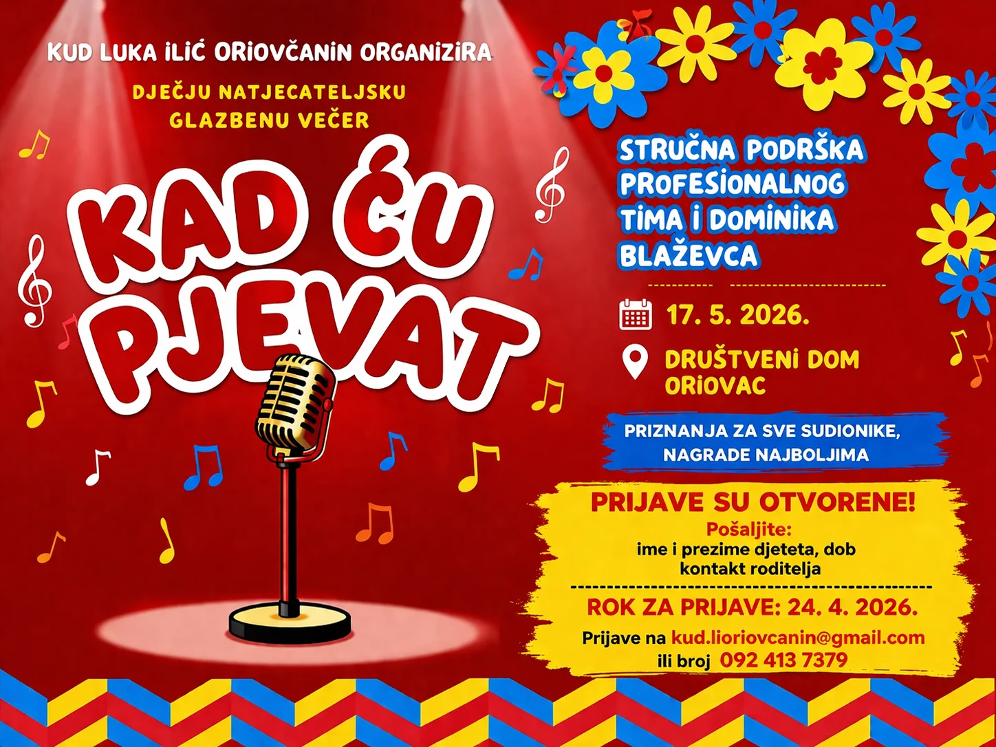 Riječ je o glazbenom događaju namijenjenom djeci koja žele pokazati svoj pjevački talent, a održat će se 17. svibnja 2026. godine u Društvenom domu u Oriovcu.